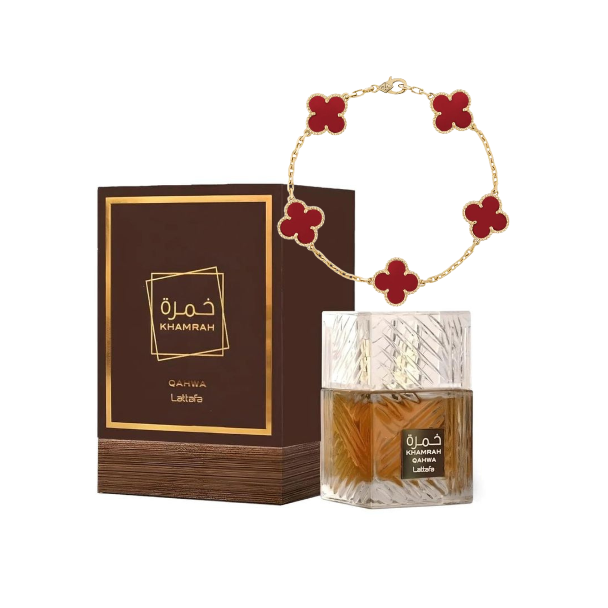 El perfume Lattafa Khamrah Eau de Parfum 100 ml aporta la parte aromática del conjunto: una mezcla cálida, dulce y especiada con notas orientales que dejan una estela fuerte y memorable. Es un aroma que impone sin necesidad de exagerar, perfecto para quienes buscan proyectar seguridad y personalidad.