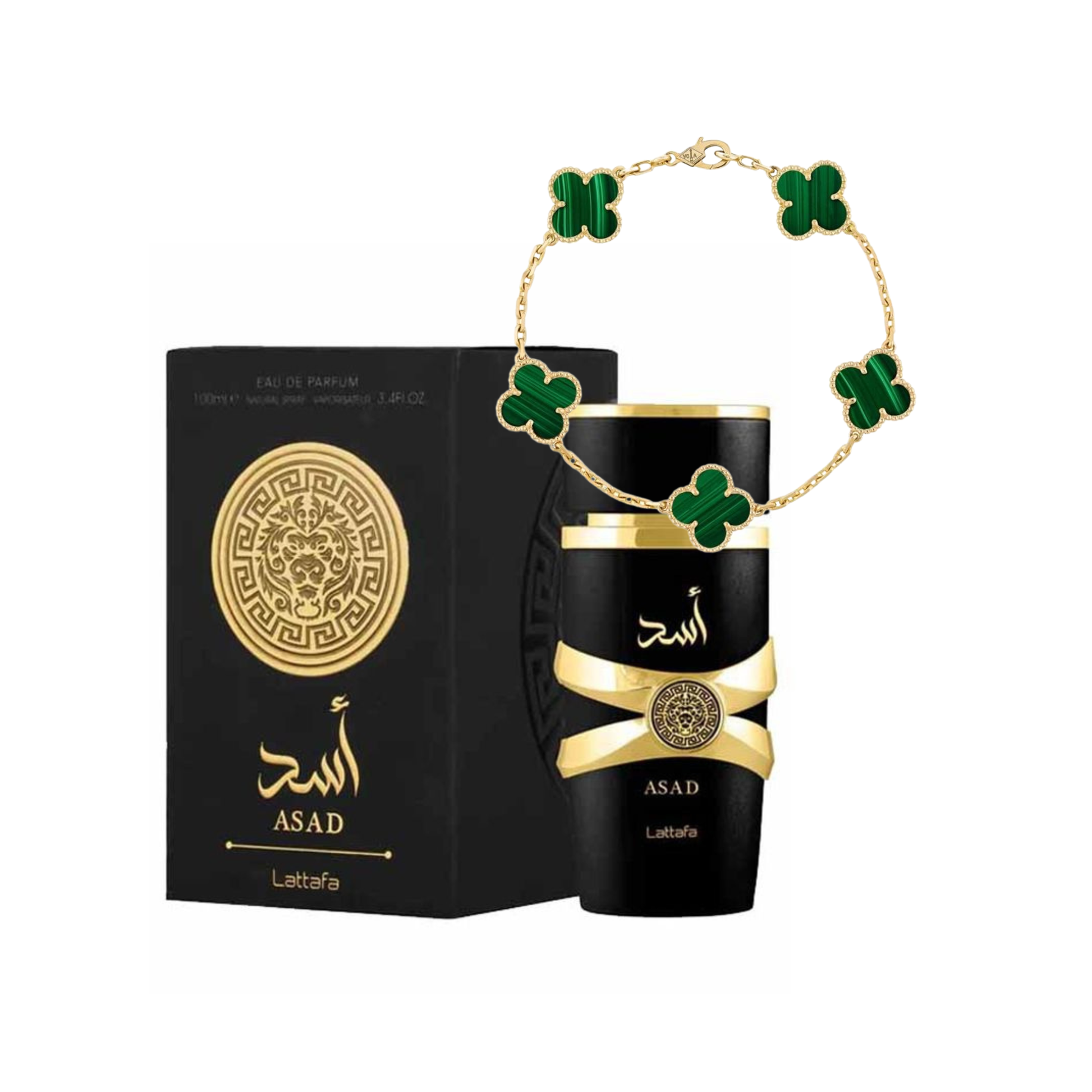 La combinación del verde brillante de la pulsera con la profundidad aromática de Asad crea un paquete equilibrado y visualmente poderoso. Ideal para regalo o para quienes buscan un look fuerte, limpio y con personalidad marcada.