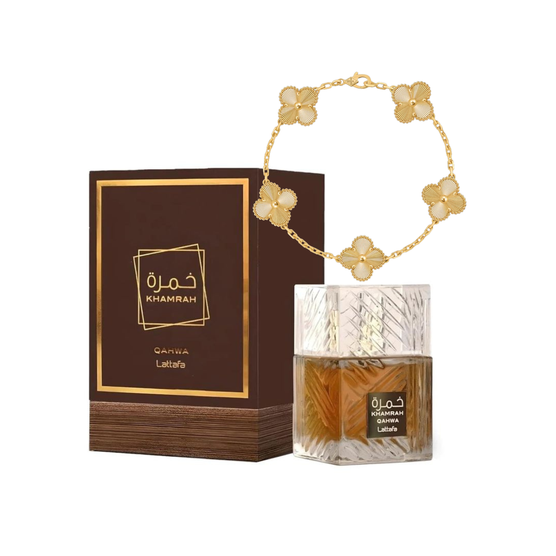 La combinación del dorado brillante con la calidez del aroma de Khamrah crea un set visualmente poderoso y aromáticamente dominante. Ideal para regalo o para quienes buscan elevar su presencia con un accesorio llamativo y un perfume que deja huella.