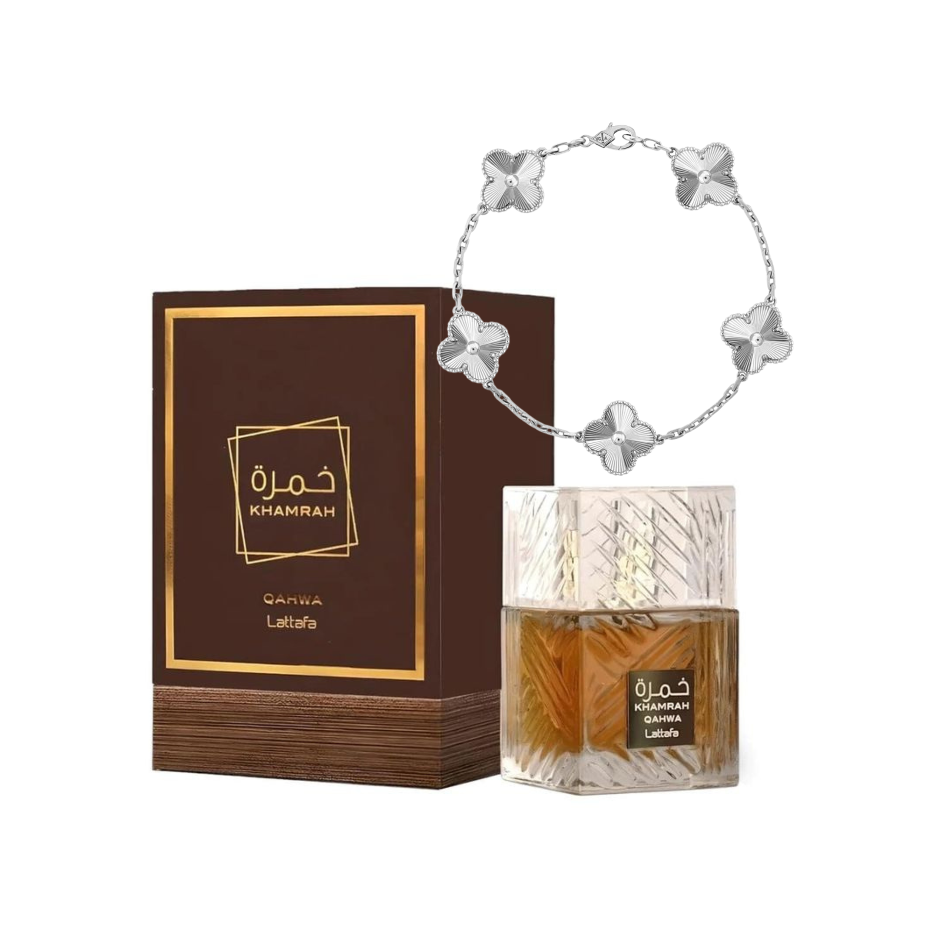 El Silver Heat Set reúne dos elementos diseñados para marcar presencia: la pulsera Silver Radiant Clover, con su brillo frío, nítido y moderno, y el perfume Lattafa Khamrah Eau de Parfum 100 ml, reconocido por su aroma cálido, especiado y envolvente.