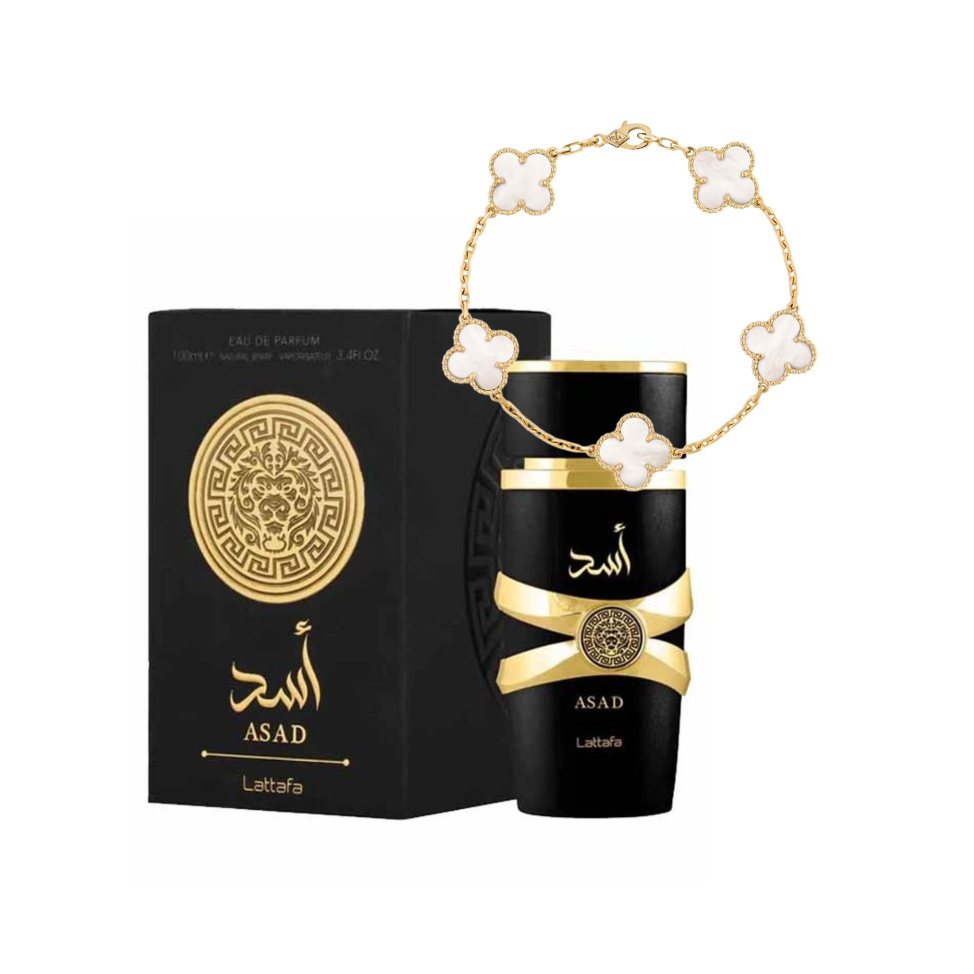 El White Asad Set combina elegancia clara con una presencia aromática intensa. La pulsera White Pearl Clover Link aporta un brillo limpio y pulido, con un acabado blanco tipo nácar que se ve fresco, moderno y sofisticado. Su contraste con los detalles dorados crea una pieza luminosa, estética y con un toque de lujo contemporáneo.